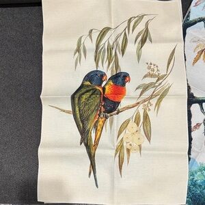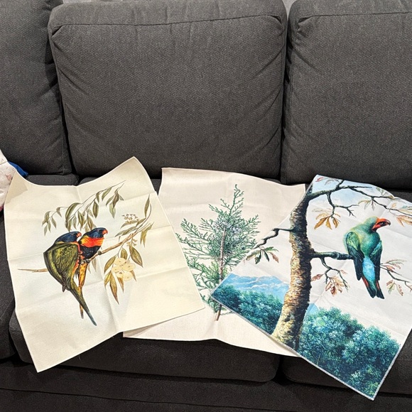 Set of three fabric pieces featuring vibrant bird and tree prints. Tapestry style prints.