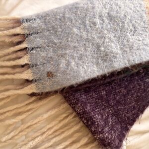Cozy scarf with a colorful block pattern. Features shades of blue, pink, and brown.