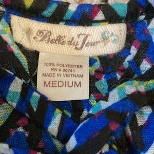 Blue top with green, burgundy, grey, and teal accents! Has a stretchy neckline and crossed straps in the back, as shown in the photos.