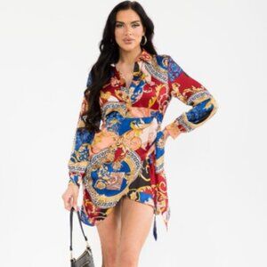Vibrant mini dress featuring a stunning mix of red, blue, and gold patterns. Perfect for making a bold statement.