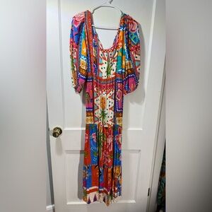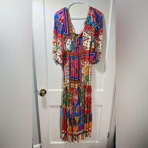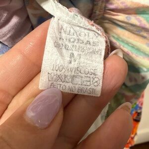 I bought this dress on a trip and wore it once. Excellent condition. 100% viscose. No brand, very soft, vibrant and beautiful.