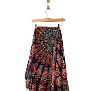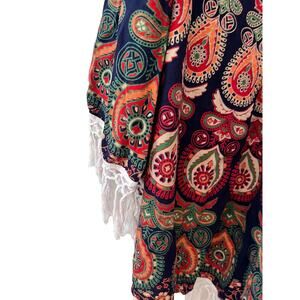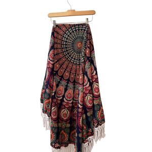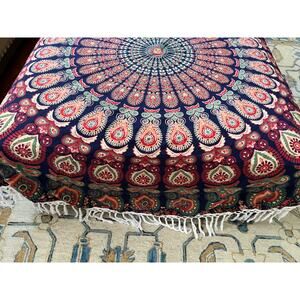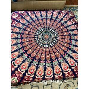 Colorful Bohemian Print Fringed Round Tablecloth. Good preowned condition, 100% cotton, made in India