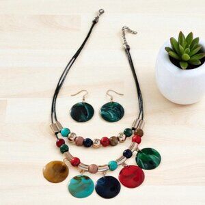 Colorful Boho Statement Necklace & Earrings Set Chunky Beaded Resin Pendant Jewe