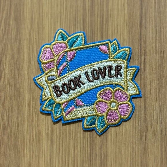 Vibrant embroidered patch with 'Book Lover' text. Features pink flowers and green leaves on a blue background.