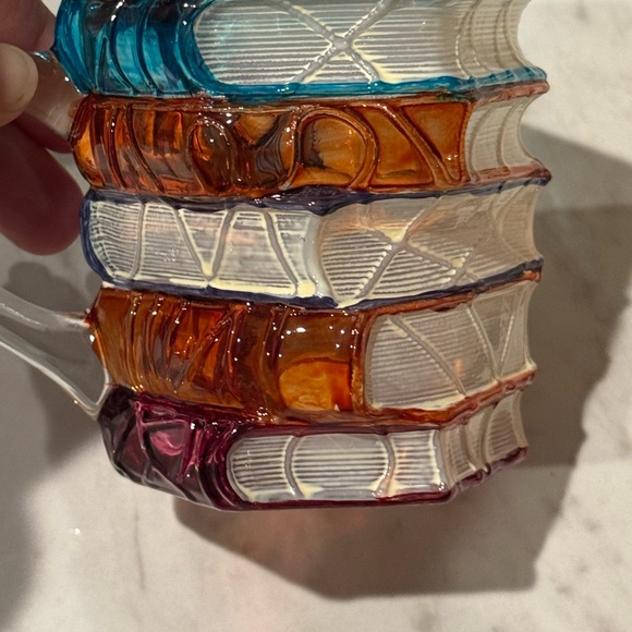 Unique glass mug shaped like a stack of books. Features vibrant colors including blue, orange, and purple.