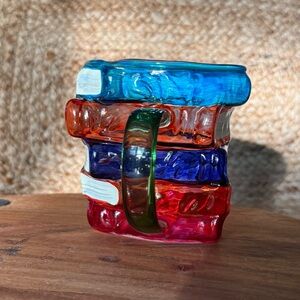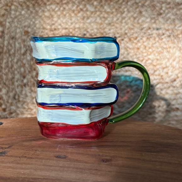 Unique mug shaped like a stack of books. Features vibrant colors with a green handle. Made of glass