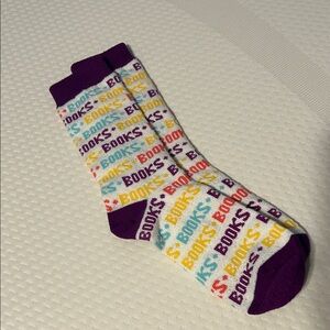 Add a splash of color to your wardrobe with these vibrant 'Books' print socks. Perfect for book lovers, these socks feature a playful design in purple, red, yellow, and blue. Comfortable and stylish for everyday wear.