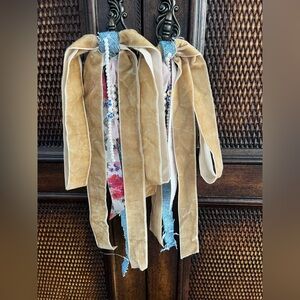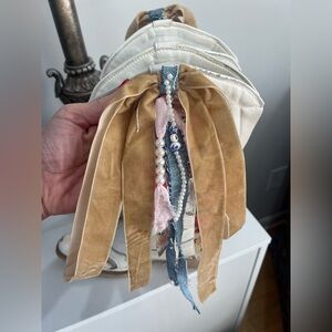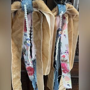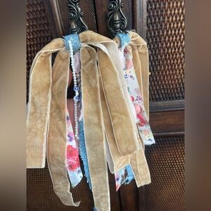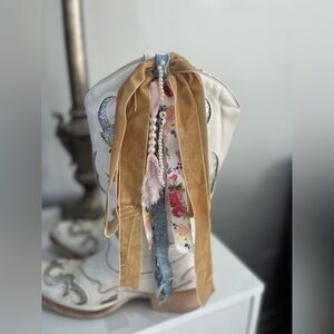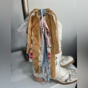 Pair of Stylish boot ribbons that include: velvet, floral, denim, and soft pink ribbons. Features pearls and porcelain beads. Ties to any cowboy boot to give a girlie accent. (Boots not included).