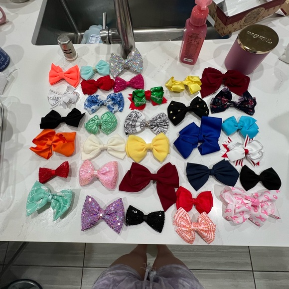 Brand new bows! Never used! bought as a gift but i’m having a boy not a girl! A vibrant collection of bows in various colors including red, pink, blue, and more. Perfect for adding a pop of color to any outfit.