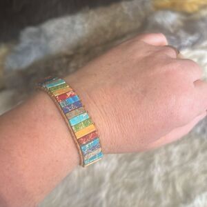 Vibrant bracelet with a rainbow of colors. Perfect for adding a pop of color to any outfit. Polished stone