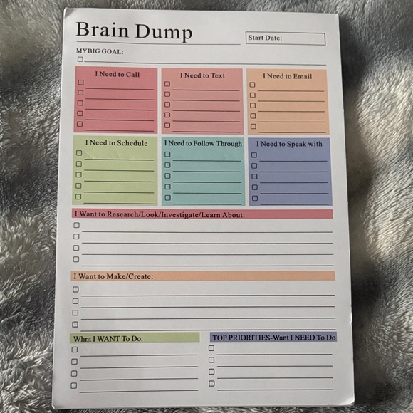 Organize your tasks with this colorful brain dump notepad. Features sections for calls, texts, emails, and more. 53 pages