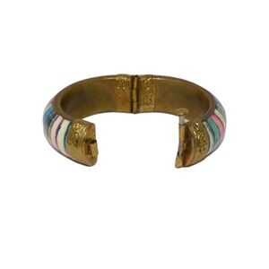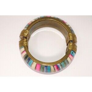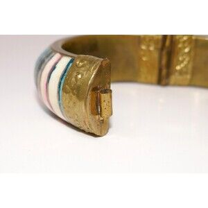 Up for sale is a beautiful Colorful Brass Pull Pin Hinged Bangle Bracelet. The interior is approx. 2.25" wide and approx. 1" thick with a Trombone Pin Fastener.