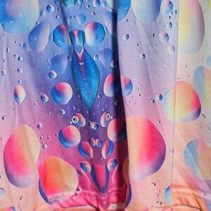 This vibrant V-neck T-shirt features a unique bubble pattern in pastel shades. Constructed from polyester, it offers a comfortable fit and eye-catching design.