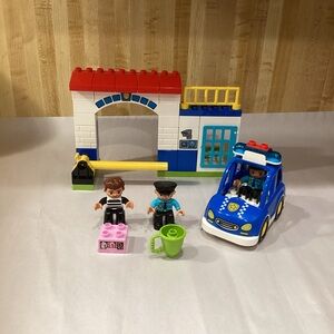 Fun building block set featuring a blue and white police car, two figures, and a colorful building structure. Includes additional accessories for imaginative play.