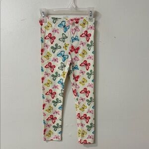 Vibrant leggings with a butterfly print. Features red, pink, yellow, green, and blue butterflies on a white background.