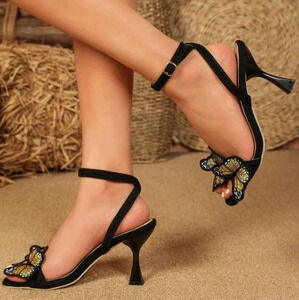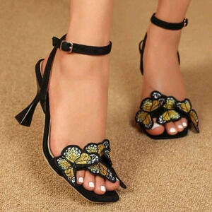 Colorful Butterfly Strap Sandals, Black Velvet, Sexy Open To Ankle Strap
