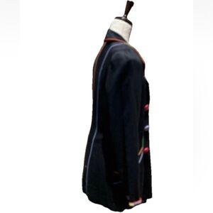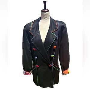 Vintage Platinum by Dorothy Schoelen Womens Black Abstract Blazer Jacket. Size tag is missing but based on approximate measurements lying flat, 21” pit to pit, 17” waist, 17 1/2” pit to cuff, and 28” length, should be a Small/Medium. Blazer has large shoulder pads which can be taken off easily. Black blazer with multicolor details and buttons. 2 front pockets. In great condition, but it is missing an inside button and has another loose button as shown in last 2 pictures.