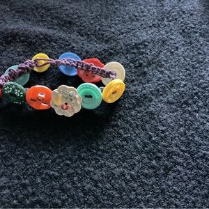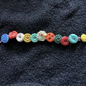 Brighten up your outfit with this colorful button bracelet. Featuring a playful mix of red, yellow, green, blue, and cream antique buttons, it's perfect for adding a fun touch to any look.