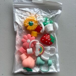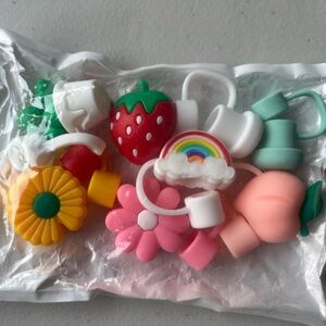 Set of six colorful cable protectors featuring fun designs: strawberry, sun, rainbow, cactus, paw, and flower. Perfect for adding a playful touch to your cables.