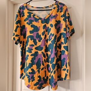 Vibrant V-neck T-shirt with a unique camouflage pattern. Features shades of purple, green, and yellow