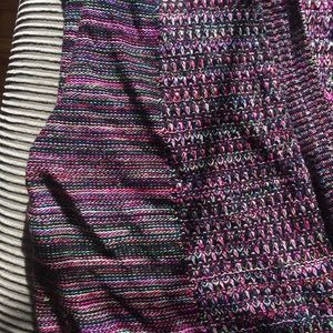 Colorful knitted cardigan. Mid length sleeve. Black, neon pink, neon yellow, and blue. There’s no longer a tag on it, but it fits like a xl