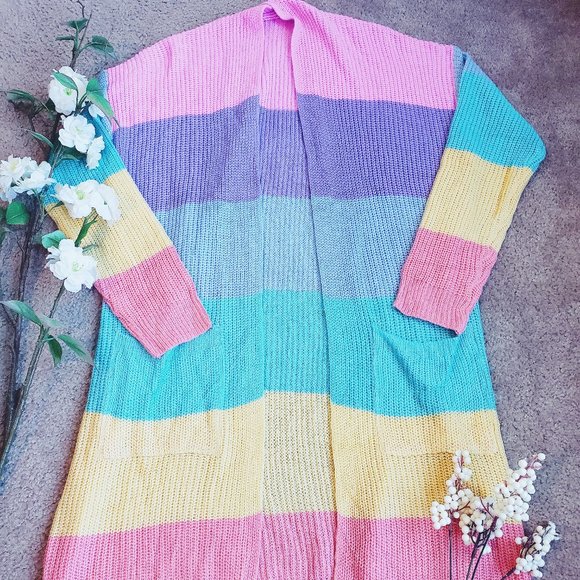 Multi color cardigan, light material and hits a bit above the knees. Worn only once.