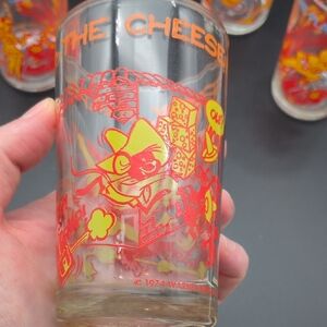 Set of four glasses with vibrant cartoon characters. Features bright red and orange designs. Graphics include Sabrina the Teenage Witch, Yosemite Sam and Speedy Gonzalez. No chips or cracks.
