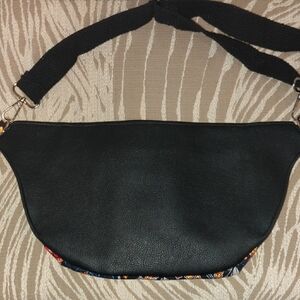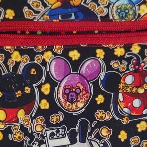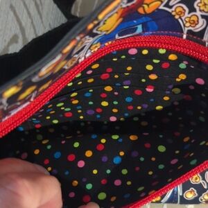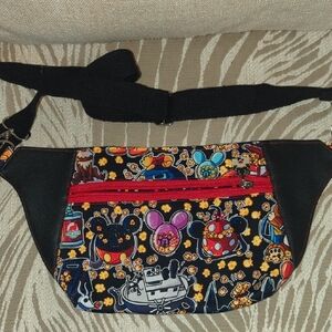 This vibrant crossbody bag features a playful cartoon print of Mickey Mouse and Winnie the Pooh, perfect for adding a pop of color to any outfit. The zipper pull is the outline of the Castle at Disney World.