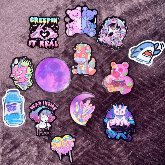 13 Vibrant cartoon stickers featuring bears, crystals, and more. Perfect for decorating.