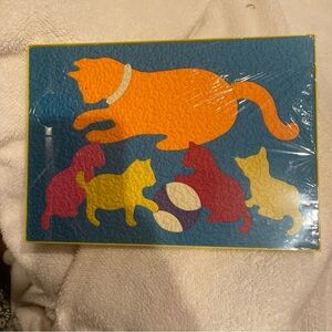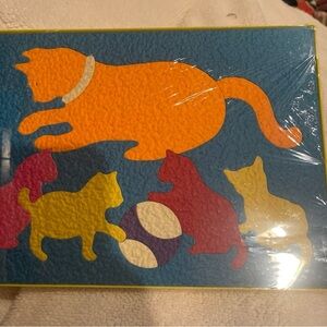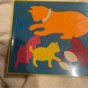 Vibrant cat-themed art print. Features playful cats in various colors. Perfect for cat lovers.