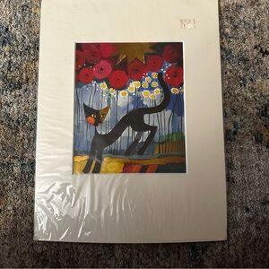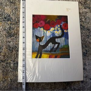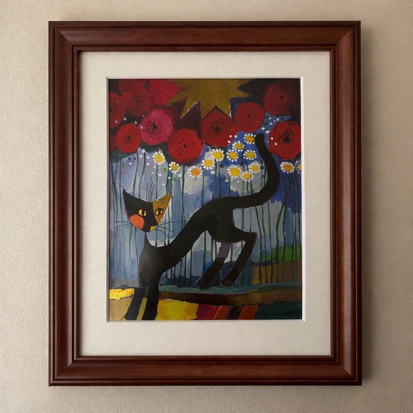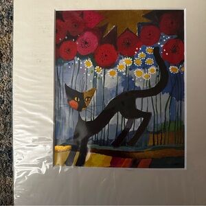 Vibrant art print featuring a black cat amidst a field of red and white flowers. Perfect for adding a splash of color to your home decor. This is a Rosina Wachtmeister cat art print. The print features a black cat in a garden setting with vibrant, stylized flowers. Collectible for cat lovers. FRAME NOT INCLUDED. See pictures for size. I bought at Estate Sale in 2002