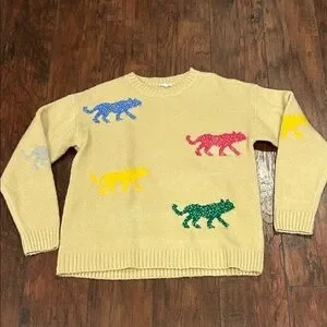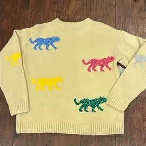 Stay cozy and stylish with this charming sweater featuring playful cat patterns in vibrant colors. Perfect for adding a fun touch to your wardrobe.