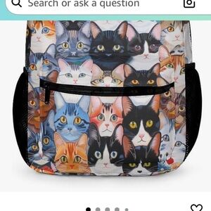 Vibrant backpack featuring a colorful cat print. Perfect for cat lovers.