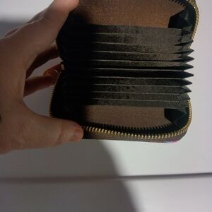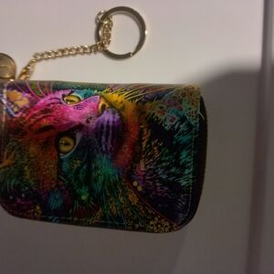 Vibrant wallet featuring a colorful cat print. Includes a gold chain detail.