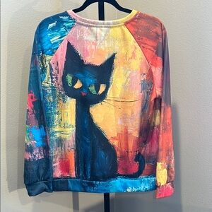Vibrant looking sleeve shirt featuring a colorful cat print. Perfect for adding a pop of color to your wardrobe.