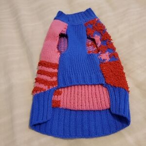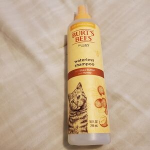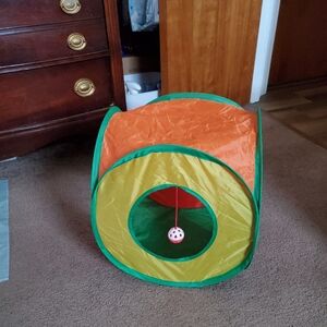 Vibrant cat toy set with a variety of textures and colors. Includes a white pillow with 'CATS ♥ CATNIP' print, square cat rainbow tunnel, a red tutu and sweater size XXS, easy clean hairbrush, bumble bee 🐝 harness, flea & tick shampoo (almost full) and brand new Burts Bees waterless shampoo and dander wipes.