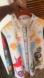 Vibrant button-up shirt with celestial and animal prints. Features red, yellow, green, and blue designs on a gray base.