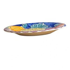 Brighten your home with this 10” vibrant abstract art plate. Featuring a stunning mix of blue, orange, and yellow, this piece adds a splash of color to any room.