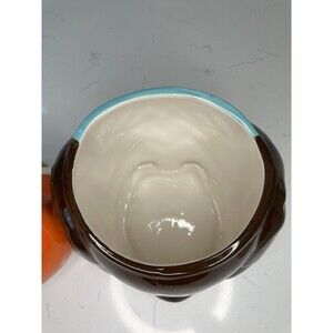 Adorable ceramic owl cookie jar / canister with vibrant orange, turquoise, brown, and white glaze. Big-eyed owl design adds a whimsical, retro touch to any kitchen or décor.