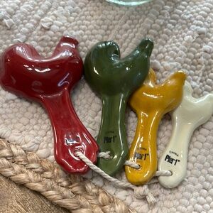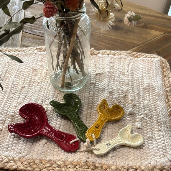 Pier 1 Country style- Chickens, set of four ceramic measuring spoon in red, green, yellow, and cream. Perfect for adding color to your kitchen.