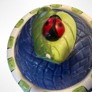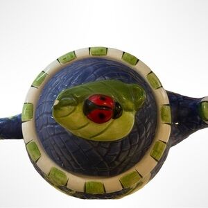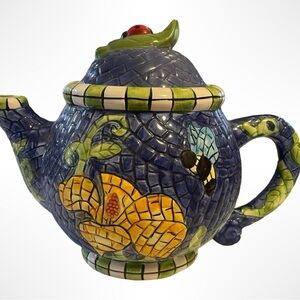 Vibrant ceramic teapot featuring a hummingbird, bee, ladybug and flowers . Blue base with yellow and green accents. Perfect for tea lovers. There is a very small chip on the leaf on the lid as pictured above.
