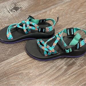 Vibrant strappy sandals with a zigzag pattern. Features teal, orange, and black colors.