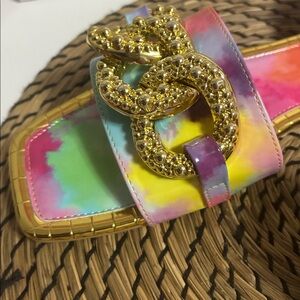 Vibrant slide sandals with a gold chain detail. Features a multicolor design with shades of pink, yellow, blue, and green. Very light and comfortable!