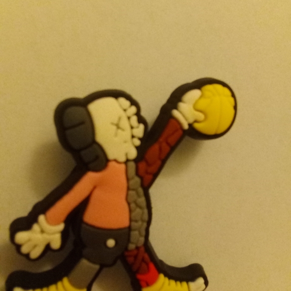 Fun and vibrant character shoe charm with a playful design. Features a mix of colors including yellow, pink, and black.