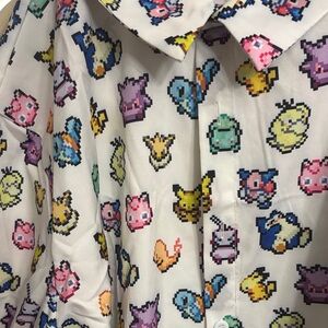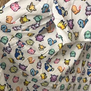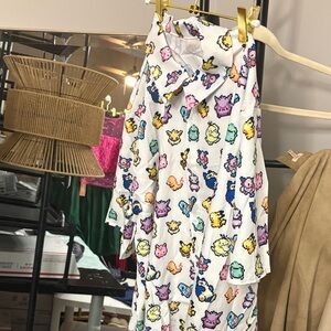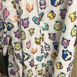 White hooded robe with colorful character prints. Features a playful design with a variety of colors.