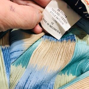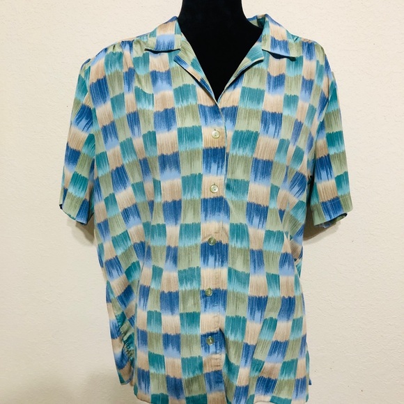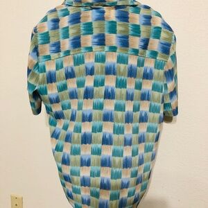 Vibrant button-up shirt with a checkered pattern. Features shades of blue, green, and cream.