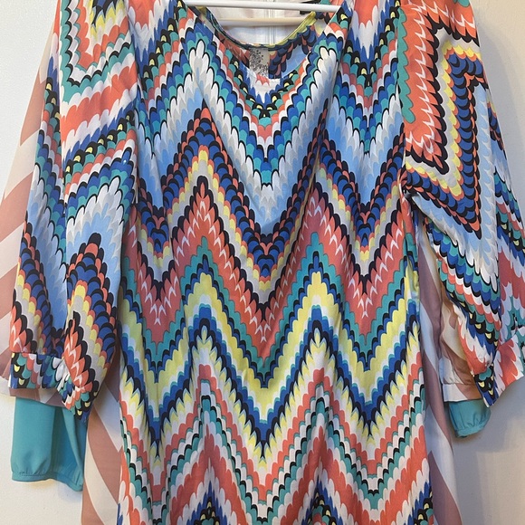 Vibrant chevron pattern dress with long sleeves. Features a mix of blue, orange, yellow, and white colors.