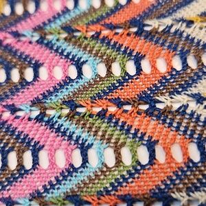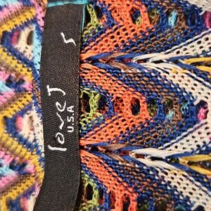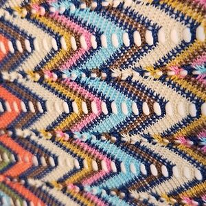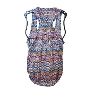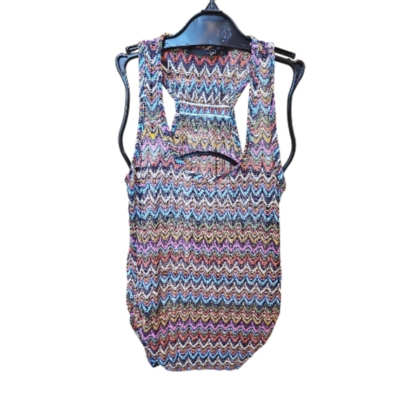 EUC Vibrant tank top in a chevron pattern with racerback backside and rounded hem. Features a mix of colors for a bold look. Perfect for casual wear. Machine washable of unknown materials - feels like polyester. Fishnet-like pattern with holes and cinched fabric on each lower side. Closet kept in a pet and smoke free home.