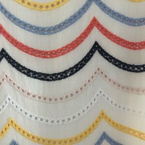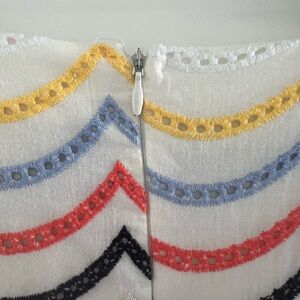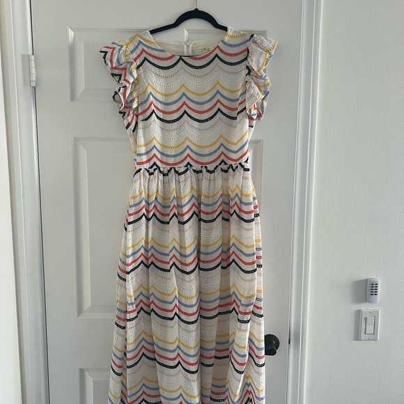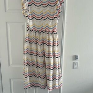 Stylish dress with chevron pattern. Features ruffled sleeves. Midi length. Falls below my knees — I’m 5’9” for reference. Zipper in the back.