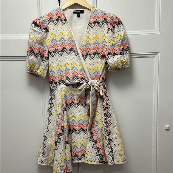 Step out in style with this vibrant mini dress featuring a colorful chevron pattern. The wrap design and puff sleeves add a playful touch, perfect for any occasion.